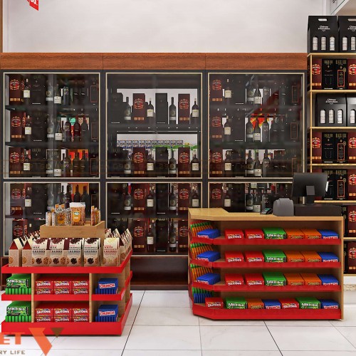 Phía bên trái cửa vào là quầy thu ngân, được thiết kế với các ngăn nhỏ tận dụng để trưng bày các loại hàng hóa bánh kẹo. Phía sau quầy là tủ rượu sang trọng và tinh tế với chất liệu gỗ và kính chủ đạo.