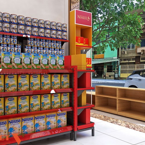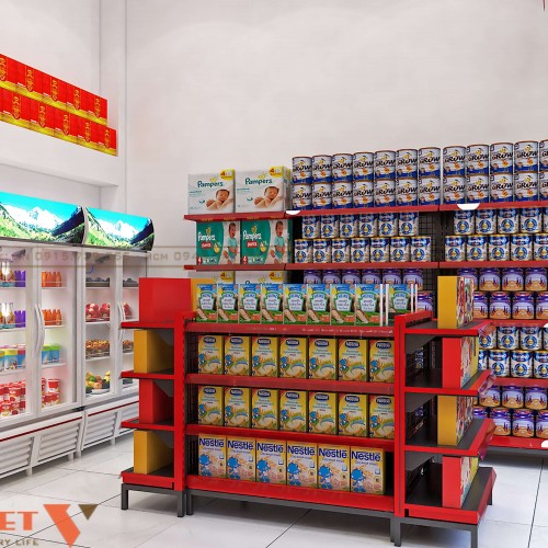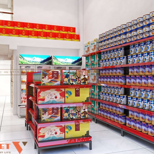 Hai bên tường của cửa hàng được bố trí các dãy kệ cao sát vách, tăng thêm diện tích trưng bày và tạo sự gọn gàng, ngăn nắp. Giá kệ có nhiều ngăn nhỏ, thuận tiện để bày biện các lon sữa, đồ chơi, và dụng cụ nhỏ xinh của trẻ nhỏ.