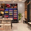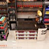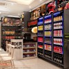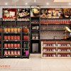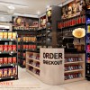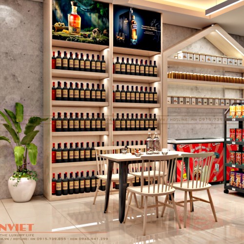 Xung quanh quầy pha chế là các mẫu giá kệ trưng bày nhiều chủng loại hàng hóa khác nhau. Ví dụ như rượu bia, bánh kẹo đến từ nhiều thương hiệu tạo nên sự phong phú mặt hàng.