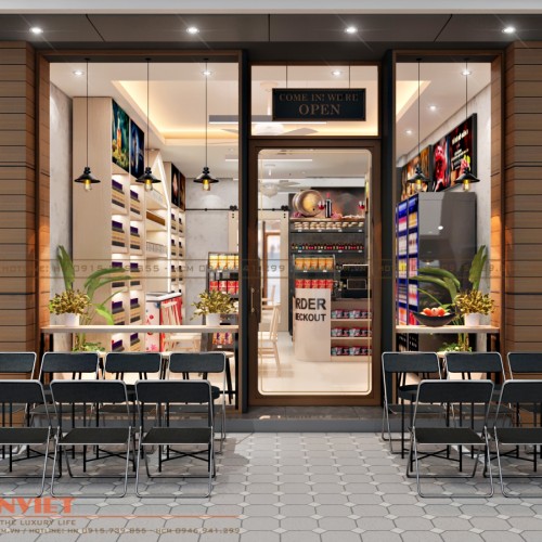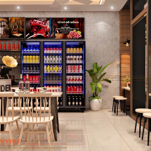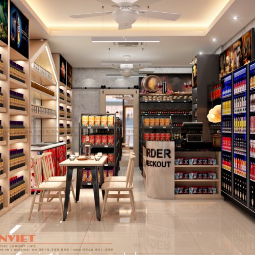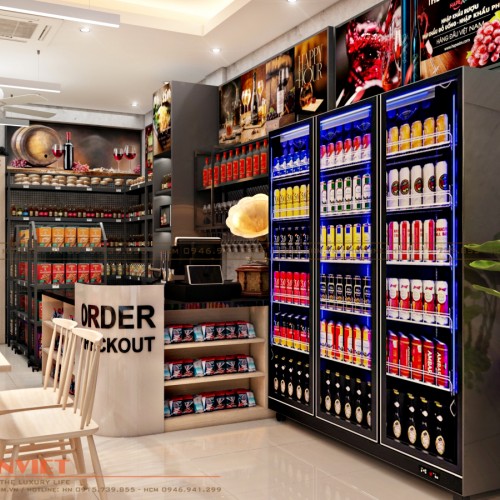 Tổng thể không gian siêu thị được bố trí khoa học, gọn gàng, tính thẩm mỹ cao. Vừa giúp trưng bày được nhiều hàng hóa vừa đem đến cho khách sự thoải mái khi thưởng thức nước uống tại chỗ.