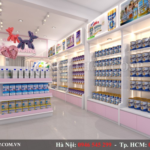 Chúng tôi sử dụng phong cách hiện đại cho mẫu thiết kế siêu thị sữa Anh Đăng – Đồng Nai. Màu hồng và trắng được lựa chọn làm tông màu chủ đạo. Điều này tạo nên cá tính riêng cho shop là sự đáng yêu, trong sáng và tràn đầy năng lượng. Những yếu tố ấy rất phù hợp với đối tượng khách hàng của shop là các bé và các mẹ.