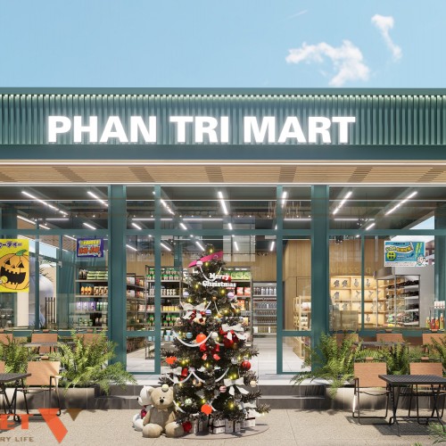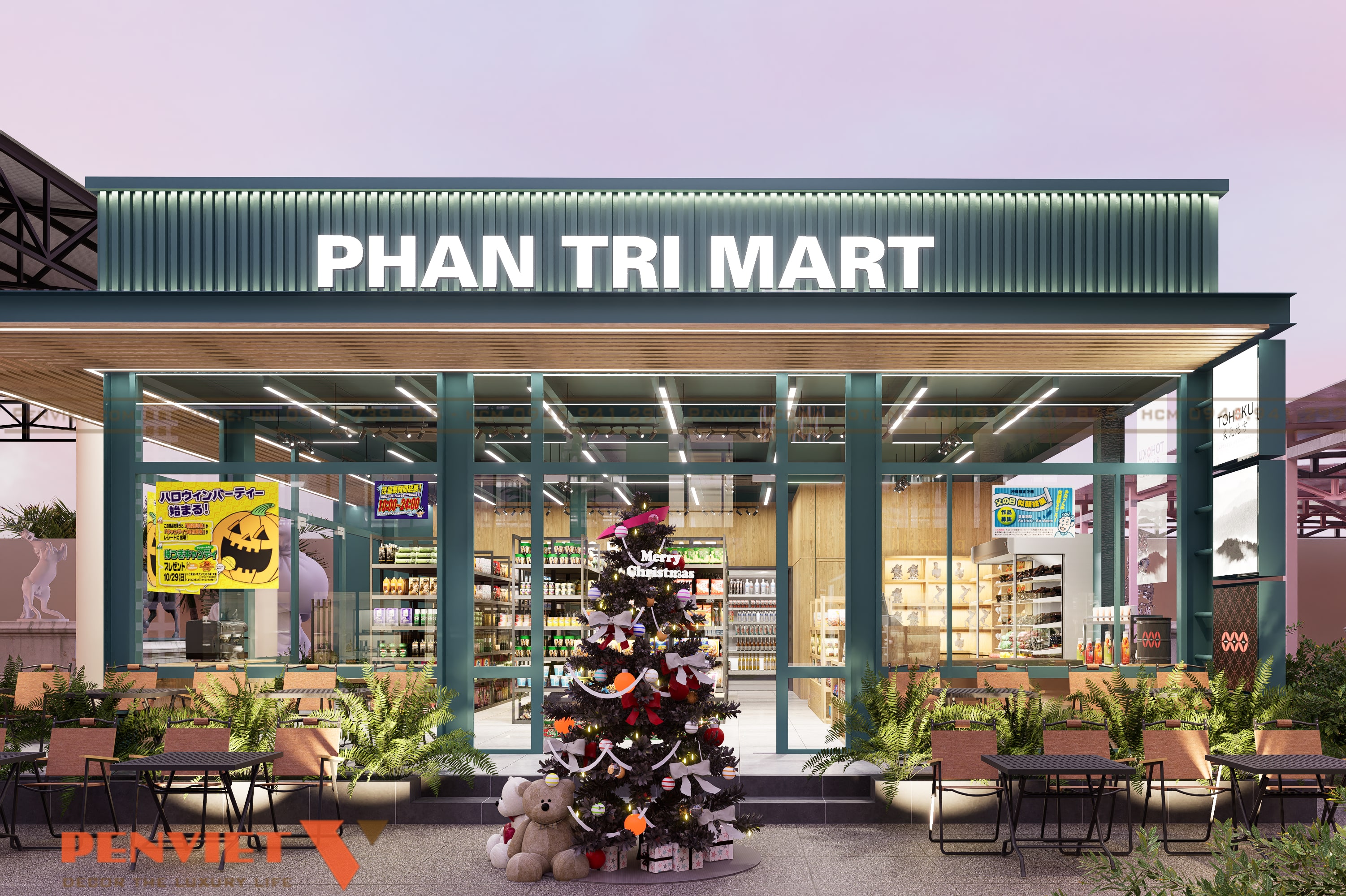 Mặt tiền siêu thị Phan Trí Mart được thiết kế theo phong cách hiện đại, tối giản nhưng nổi bật. Biển hiệu lớn với tên thương hiệu đặt chính giữa giúp tăng khả năng nhận diện từ xa, đặc biệt vào buổi tối. Hệ đèn chiếu sáng mặt đứng được bố trí đều, tạo cảm giác chuyên nghiệp và sạch sẽ.