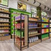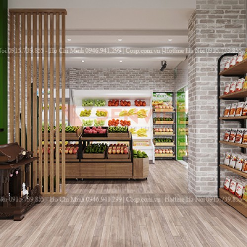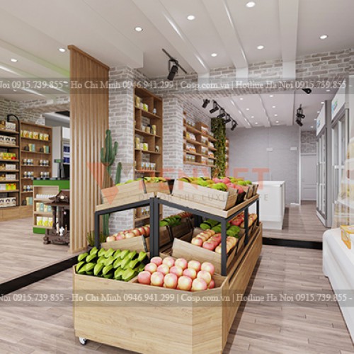 Hoa quả là nguồn dinh dưỡng mang lại sức khỏe và vitamin cho cơ thể, đặc biệt với những người ăn chay thì đây là sản phẩm cần thiết và không thể thiếu. Trong dự án thiết kế siêu thị làn này, các kệ được làm từ gỗ thông công nghiệp chống thấm nước để phù hợp với các loại hoa quả tươi.