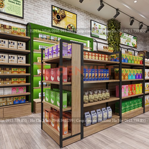 Để có thêm nhiều diện tích để trưng bày sản phẩm, chúng tôi sử dụng các kệ thấp ở vị trí trung tâm cửa hàng. Các kệ này có kích thước nhỏ hơn nhưng được phân chia thành nhiều tầng kết hợp giữa khung sắt sơn tĩnh điện và kệ gỗ MDF chống ẩm phủ melamine mang lại sự hiện đại và đồng bộ cho thiết kế siêu thị Chay Tốt Market.