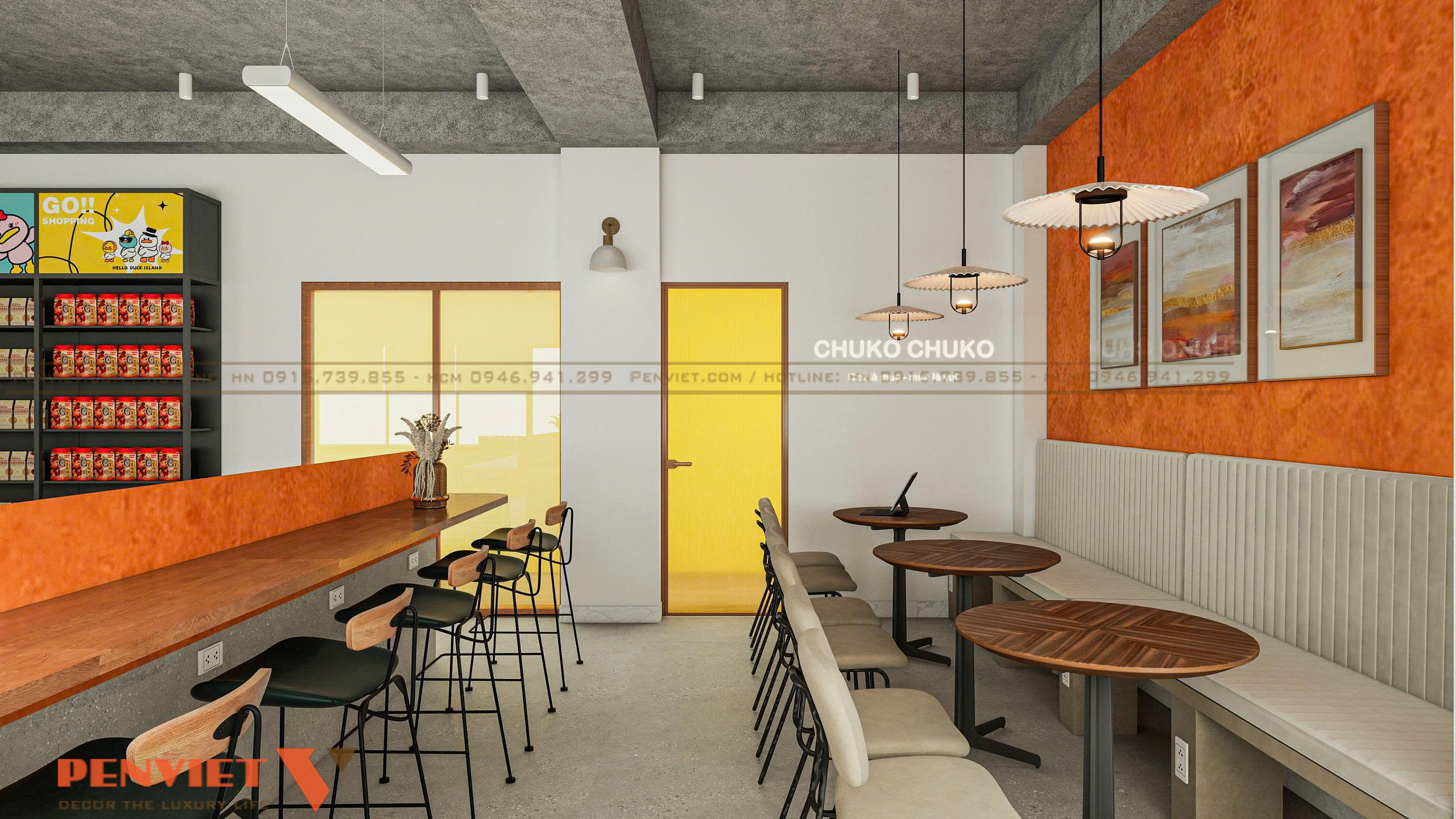 Khu vực thu ngân và đón khách: Được bố trí ngay trung tâm tầm nhìn từ cửa vào, quầy thu ngân có thiết kế vuông vức, mặt ốp trắng tinh tế. Phía sau là logo CHUKO CHUKO nổi bật trên nền tường vàng, giúp khách hàng dễ nhận biết thương hiệu ngay từ lần đầu ghé thăm. Không gian này cũng được tính toán sao cho khách hàng dễ dàng di chuyển, thanh toán nhanh gọn, hạn chế tình trạng ùn tắc trong giờ cao điểm.