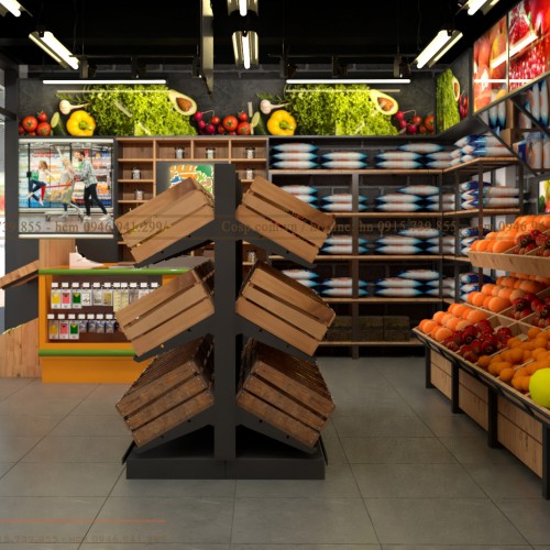 Mẫu thiet ke sieu thi mini sử dụng triệt để không gian để trưng bày được nhiều sản phẩm nhất có thể nhưng lại không làm khách hàng bị chật chội . những chiếc kệ giữa nhà có nhiệm vụ ngăn cách không gian để tạo thành lối đi cho siêu thị. kệ được thiết kế bằng gỗ thông và sắt sơn tĩnh điện.