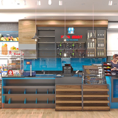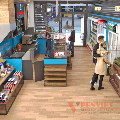 Nhằm tối ưu không gian trưng bày, thiết kế nội thất siêu thị này được PenViet tư vấn sử dụng quầy thanh toán kết hợp kệ hàng bằng gỗ MDF phủ melamine kết hợp với đợt kính cường lực và ốp đá nhân tạo mặt trên, điều này cũng kích thích khách hàng mua sắm thêm sản phẩm trong khi chờ thanh toán.