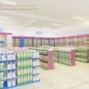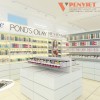 Khu vực bày bán mỹ phẩm được bố trí hệ thống quầy kệ bằng gỗ MDF chống ẩm phủ Melamine với kiểu dáng hiện đại, tạo sự đồng điệu, nhất quán trong phong cách thiết kế siêu thị.