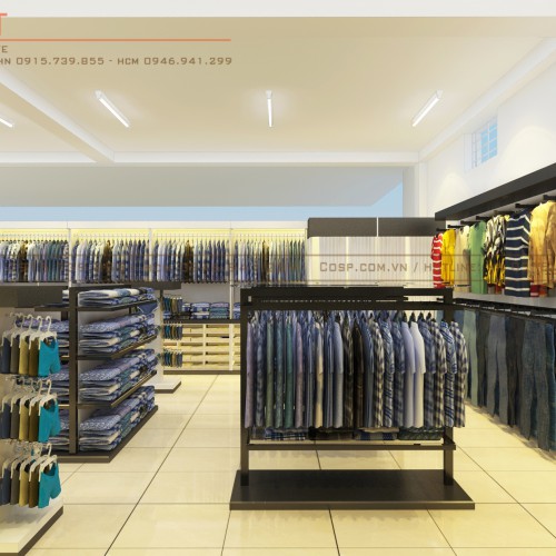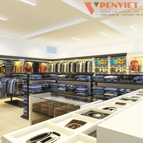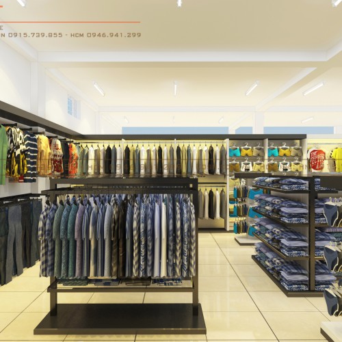 Để đáp ứng yêu cầu bày bán số lượng sản phẩm lớn, chúng tôi tư vấn lắp đặt các thanh treo, kệ trưng bày khung sắt sơn tĩnh điện kết hợp gỗ Melamine.