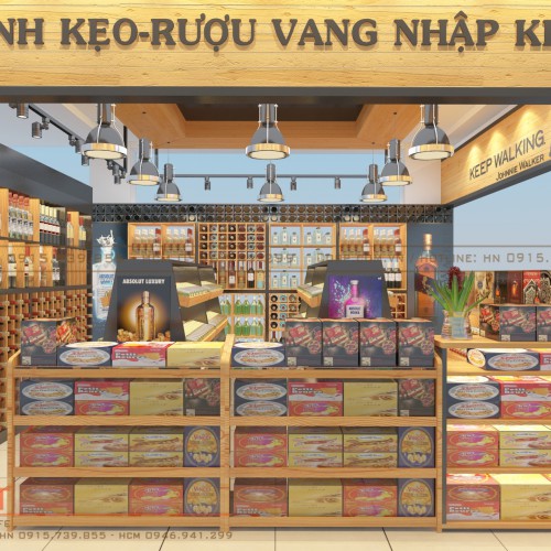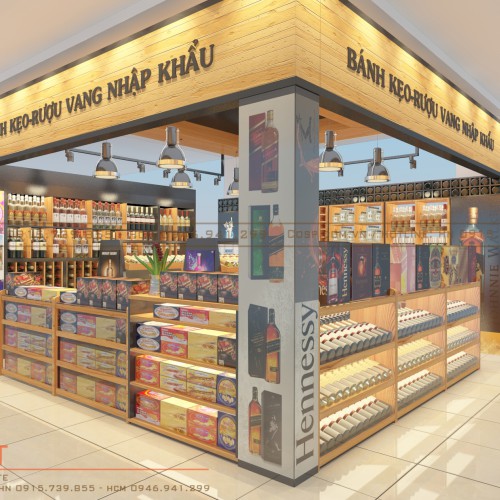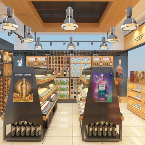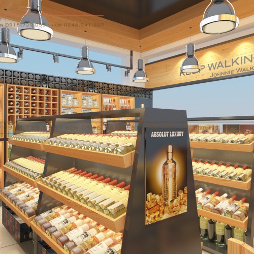 Gian hàng trong thiết kế nội thất siêu thị cũng sử dụng gỗ Melamine và khung sắt sơn tĩnh điện tạo nên sự vững chãi và giảm độ rung cho không gian trưng bày rượu.
