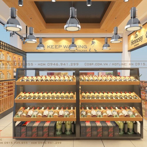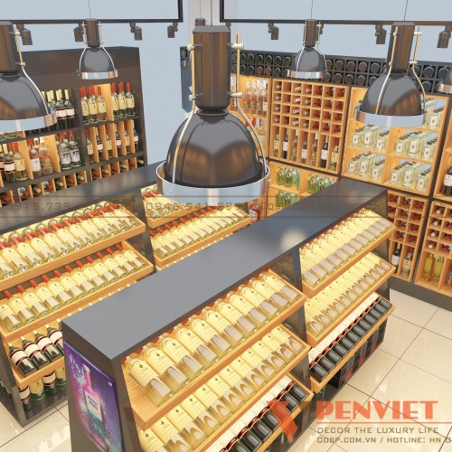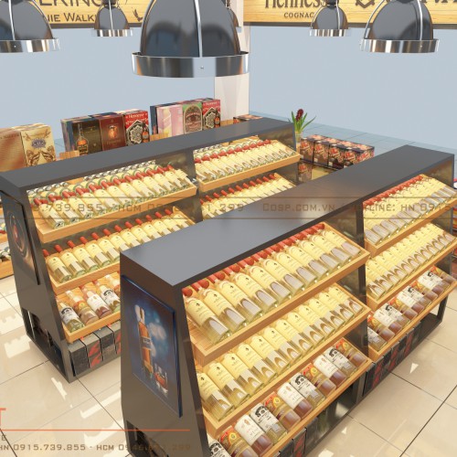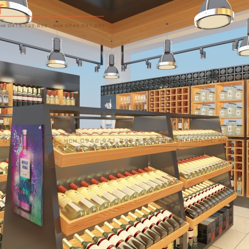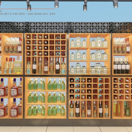 Quầy rượu trong thiết kế siêu thị sử dụng các kệ hàng đảm bảo có thể đặt sản phẩm nằm ngang hoặc nghiêng 45 độ để đảm bảo các nút bần bằng gỗ sồi của chai rượu không bị khô và co lại, khiến rượu bị oxy hóa.