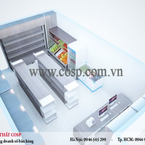 Rất nhiều khách hàng tìm đến Nội thất Cosp để thiết kế nội thất siêu thị. Vì sao vây? Trước hết điều đó làm chúng tôi rất vui vì vừa phục vụ được nhu cầu của khách hàng vừa làm dầy thêm được dự án vào bộ sưu tầm những mẫu thiết kế siêu thị đẹp trên Cosp.com.vn. Thiết kế siêu thị mini anh Nhân- Quận 3 cũng nằm trong số đó và hôm nay xin giới thiệu những hình ảnh thiết kế 3D cùng những ảnh thi công thực tế của siêu thị này nhé.