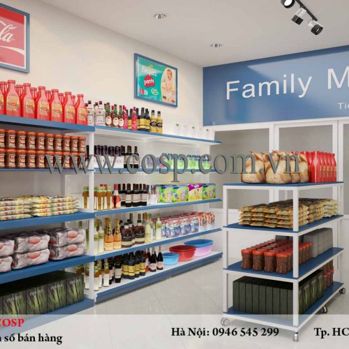 Diện tích cửa hàng khoảng 50m2 khu vực kệ hàng, kệ thu ngân cần được bố trí hợp lý để thuận tiện cho việc di chuyển và mua sắm dễ dàng. Vì thế cách sắp xếp nội thất trong siêu thị được tham khảo rất kỹ càng.