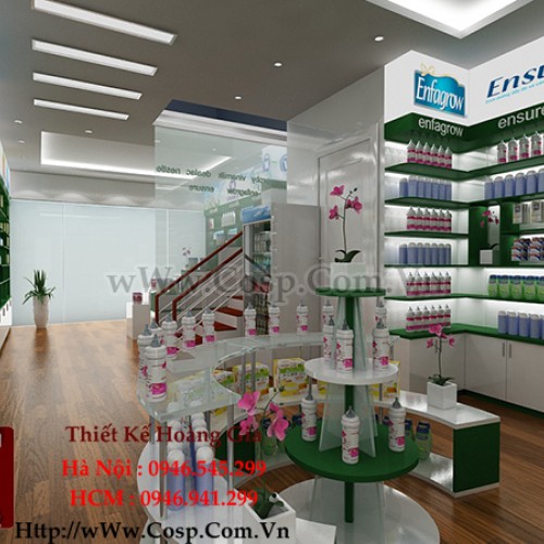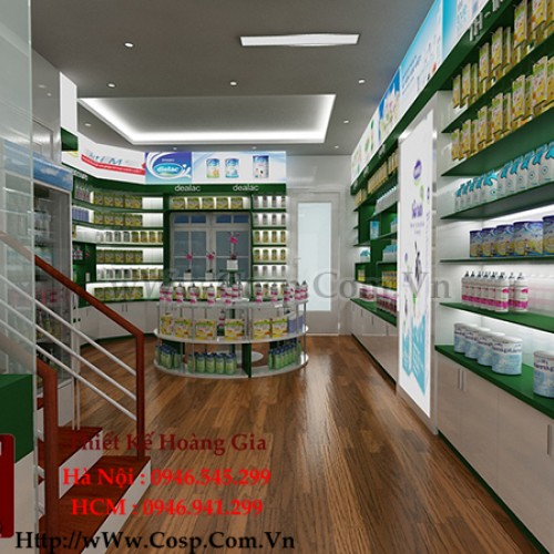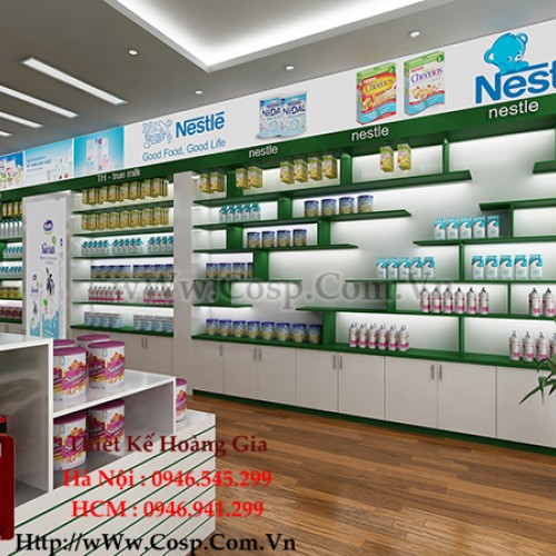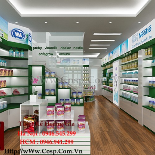 Siêu thị sữa này sử dụng chủ yếu loại gỗ MDF phun sơn 2k để làm nội thất. Bàn thu ngân nối liền với hệ thống tủ sát tượng tránh mất diện tích. Kệ cao sát tường, có nhiều ngăn tủ bên dưới có tay cầm và khóa, sử dụng nhiều đợt gỗ khác nhau để đựng sữa hộp. Phía trên trán tủ dán tranh poster quảng cáo các loại sữa.