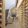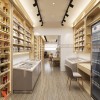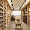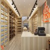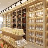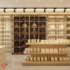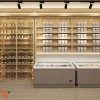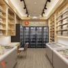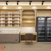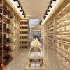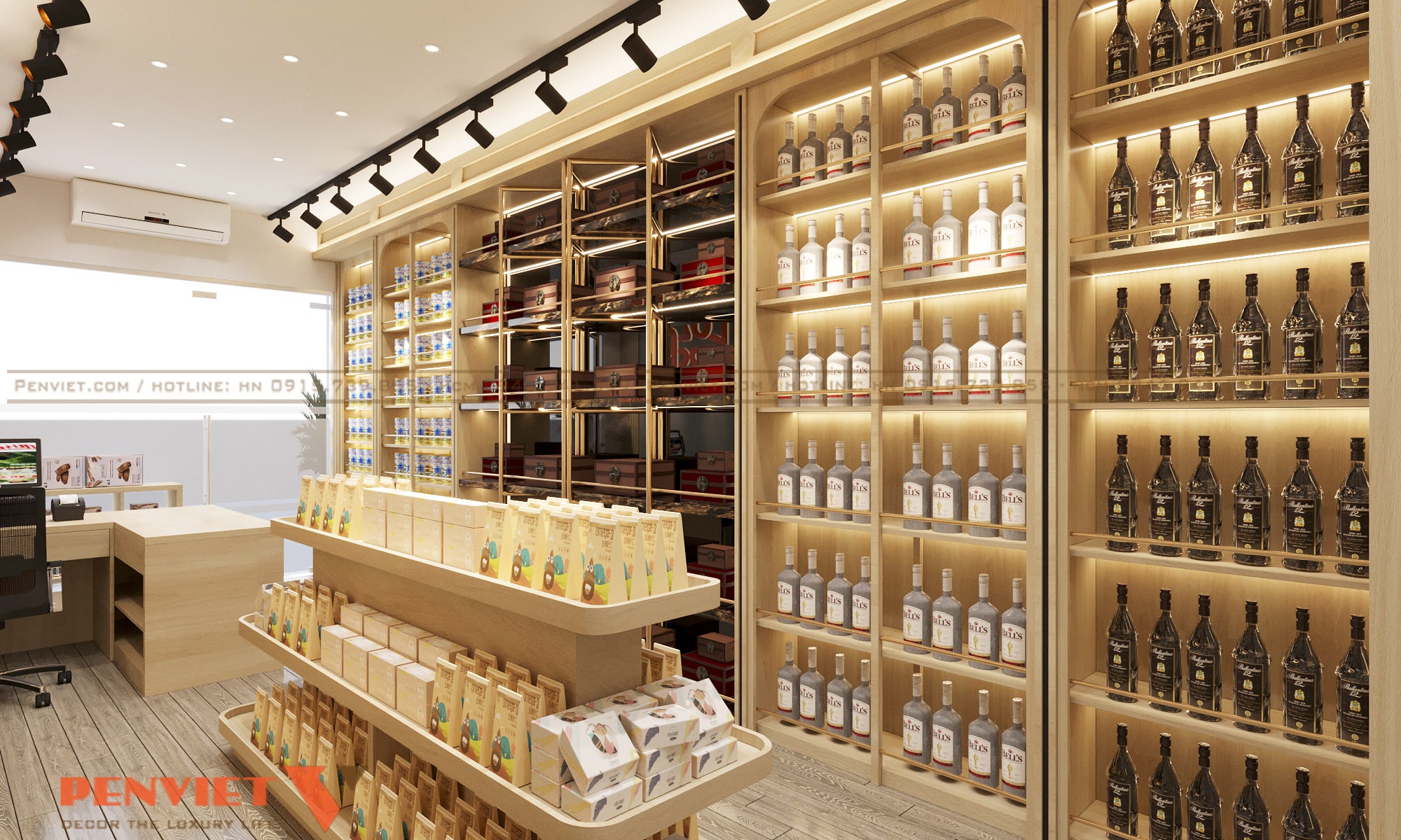 Hệ thống kệ trưng bày âm tường và đảo trung tâm được bố trí hợp lý, vừa tận dụng được không gian đứng, vừa giữ được lối đi rộng rãi. Màu gỗ sáng chủ đạo kết hợp cùng ánh sáng vàng giúp tổng thể cửa hàng trở nên ấm áp, gần gũi nhưng không kém phần sang trọng.