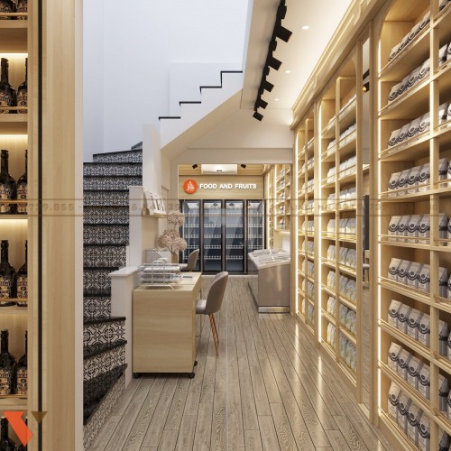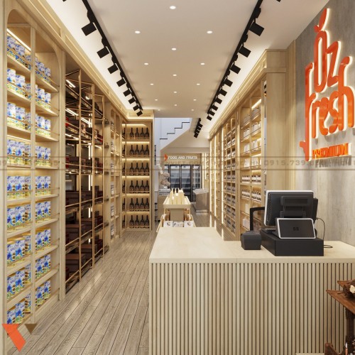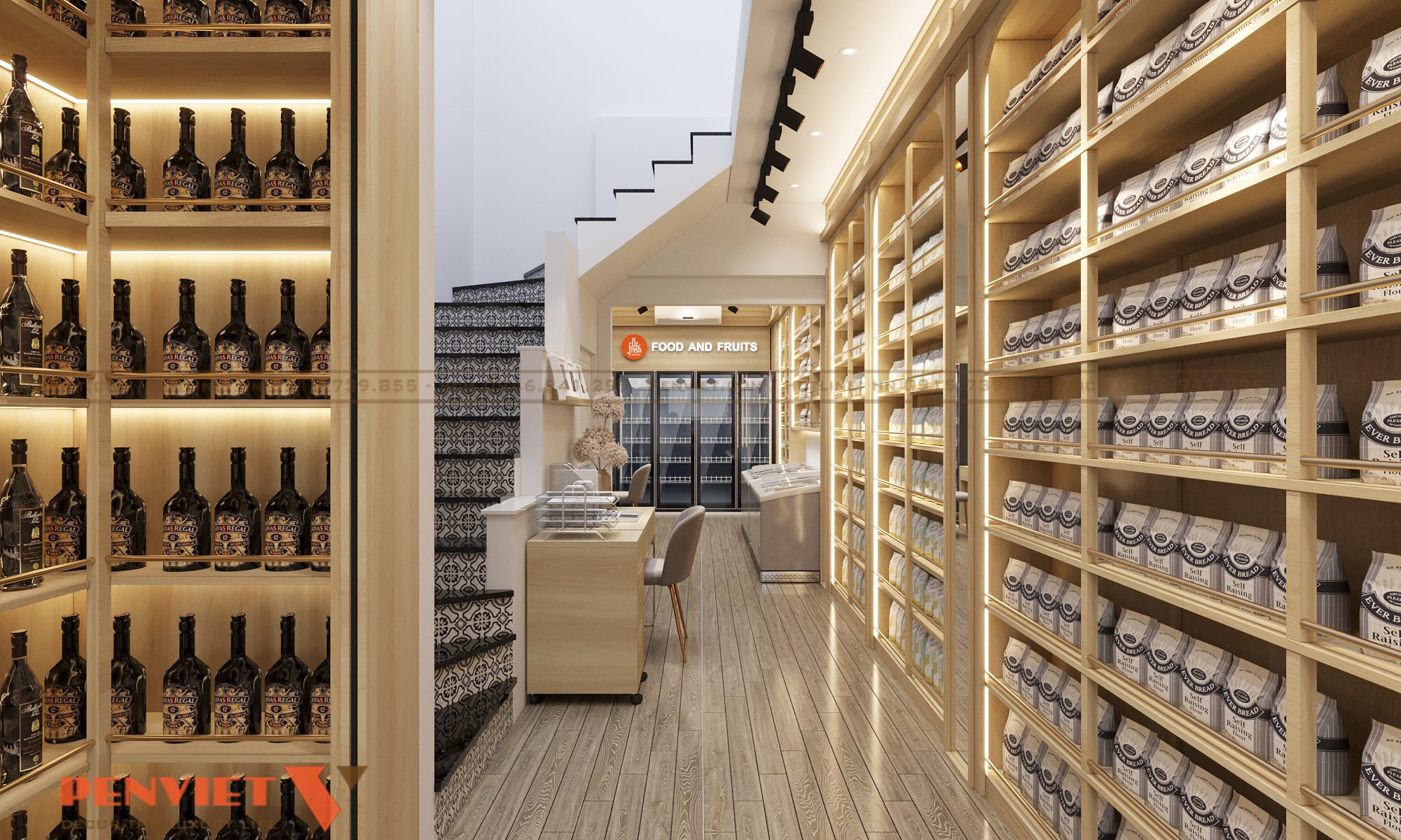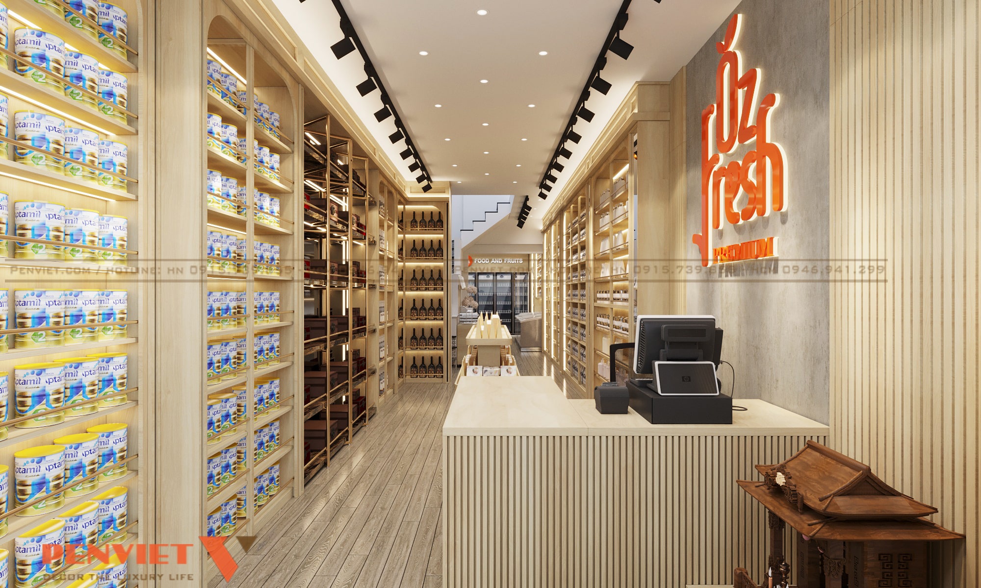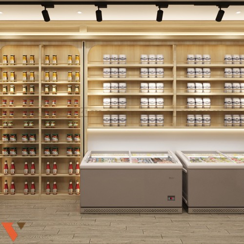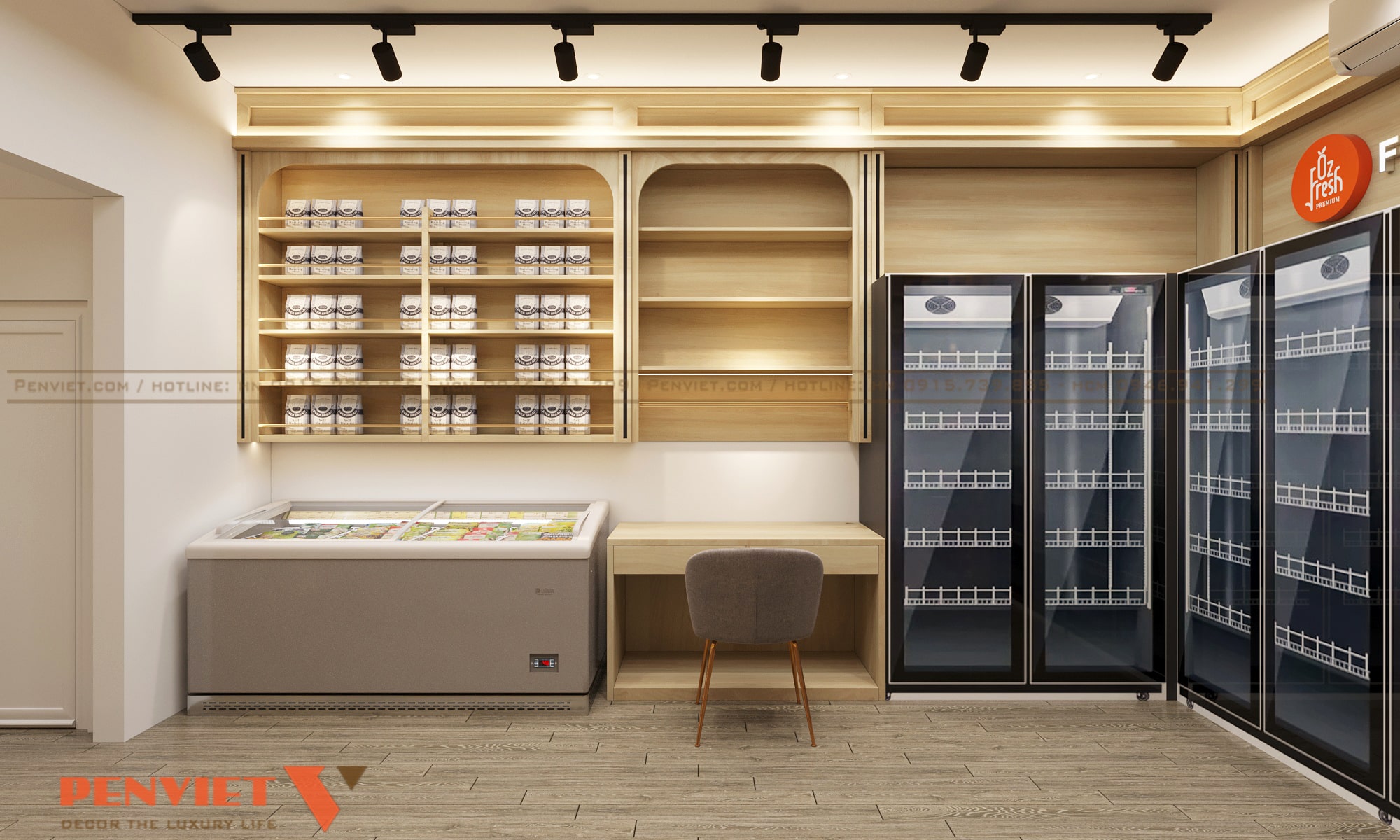 Sự phối hợp giữa vật liệu gỗ, ánh sáng ấm và bố cục đều đặn khiến không gian nhỏ vẫn giữ được cảm giác sang trọng, đồng thời thể hiện phong cách riêng của siêu thị.