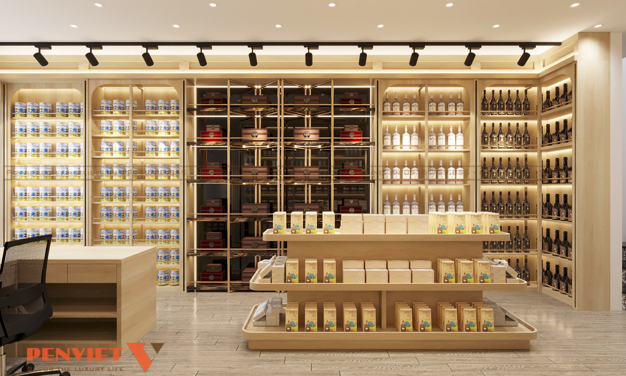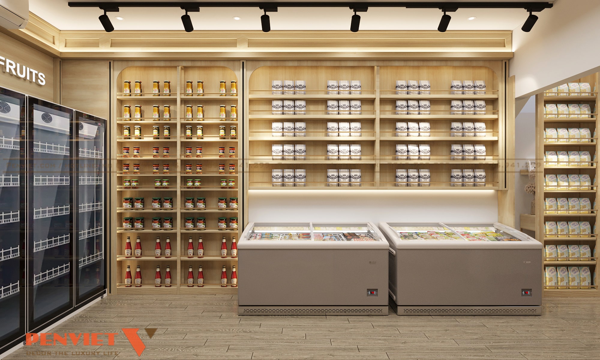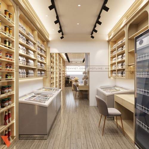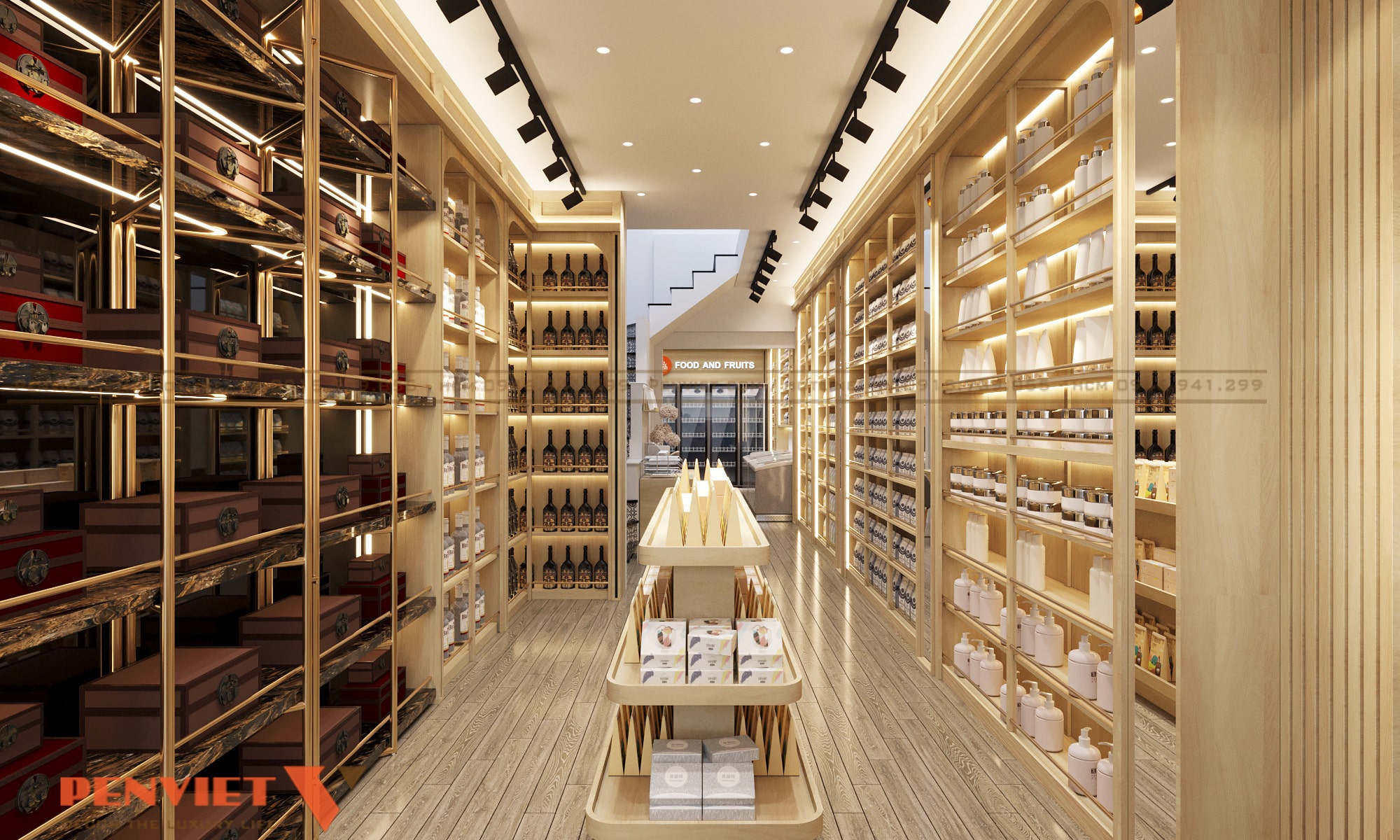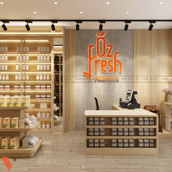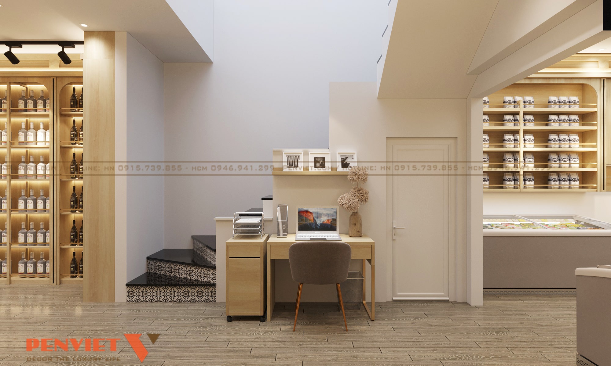 Sự phối hợp giữa vật liệu gỗ, ánh sáng ấm và bố cục đều đặn khiến không gian nhỏ vẫn giữ được cảm giác sang trọng, đồng thời thể hiện phong cách riêng của siêu thị.