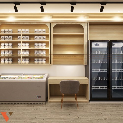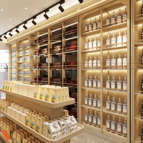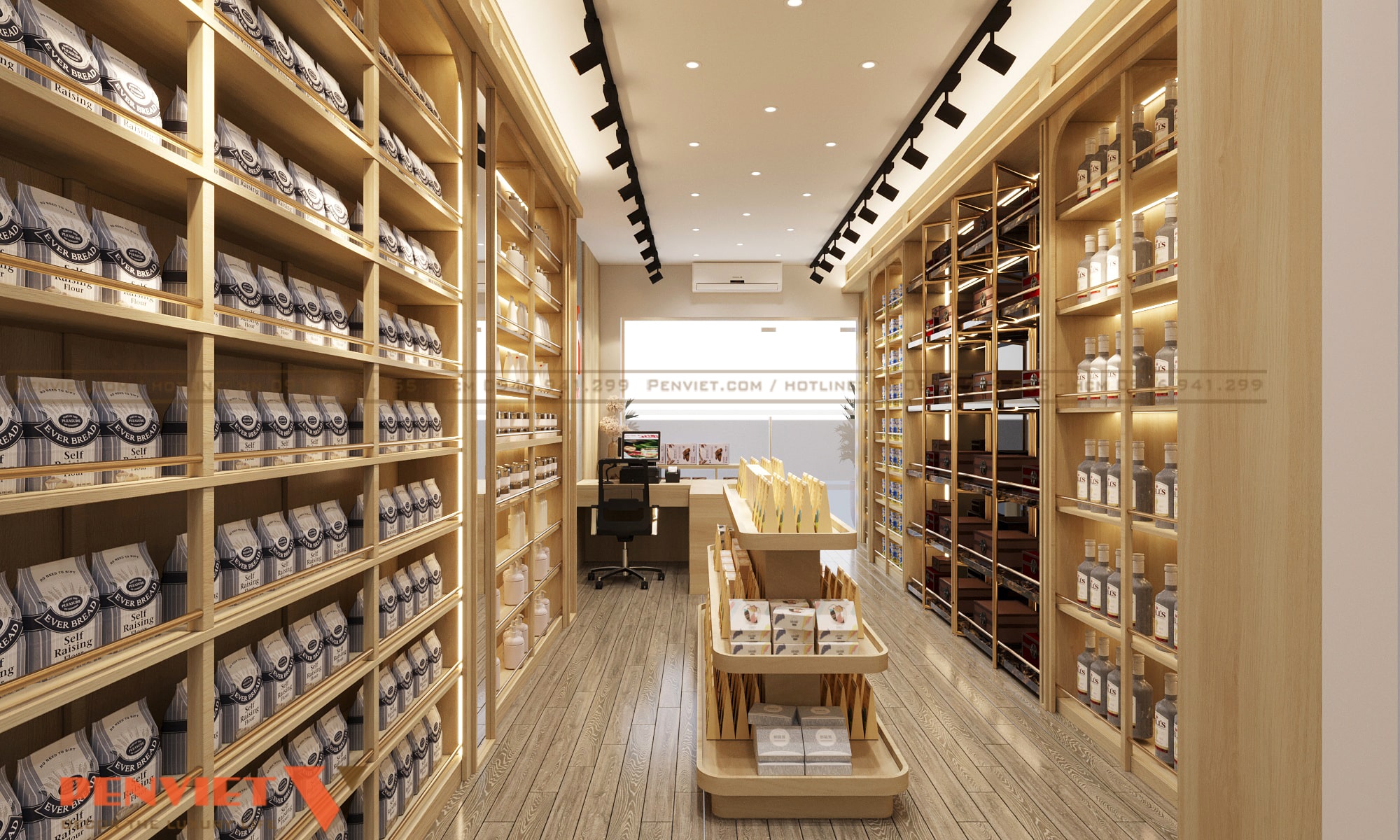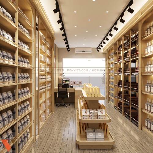 Phía bên phải quầy, hệ kệ nhỏ âm tường được tận dụng để trưng bày các sản phẩm nhỏ gọn, dễ mua, góp phần gia tăng doanh thu từ nhóm hàng tiện lợi. Tất cả chi tiết này đều được tính toán kỹ nhằm mang đến hiệu quả kinh doanh thực tế chứ không chỉ dừng ở yếu tố thẩm mỹ.