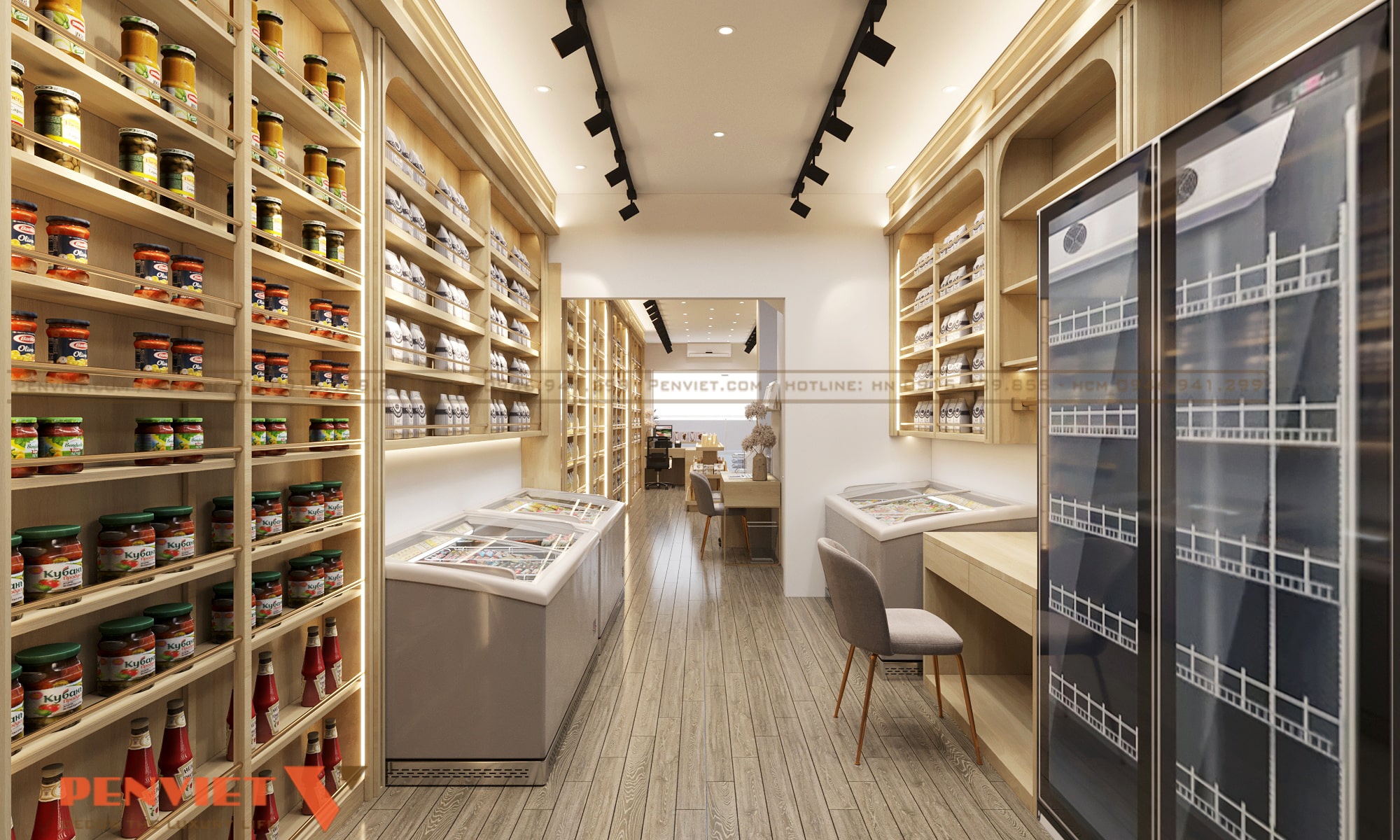 Điểm khác biệt của dự án thiết kế siêu thị mini nằm ở cách xử lý không gian thông minh. Thay vì chia nhỏ khu vực, kiến trúc sư đã chọn giải pháp mở, tạo sự liên kết giữa các khu vực thông qua ánh sáng, màu sắc và vật liệu. Nhờ vậy, không gian dù nhỏ nhưng vẫn đảm bảo sự thoáng đãng và lưu thông thuận tiện.