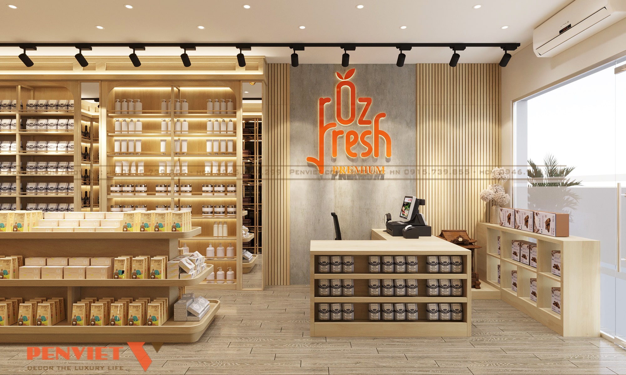 Ngay khi bước vào cửa hàng, khu vực quầy thu ngân nổi bật với logo thương hiệu “Oz Fresh Premium” gắn trên nền tường xi măng xám kết hợp phào nan gỗ. Tông màu trung tính kết hợp sắc cam thương hiệu tạo nên điểm nhận diện mạnh mẽ, mang lại cảm giác tin cậy và chuyên nghiệp.