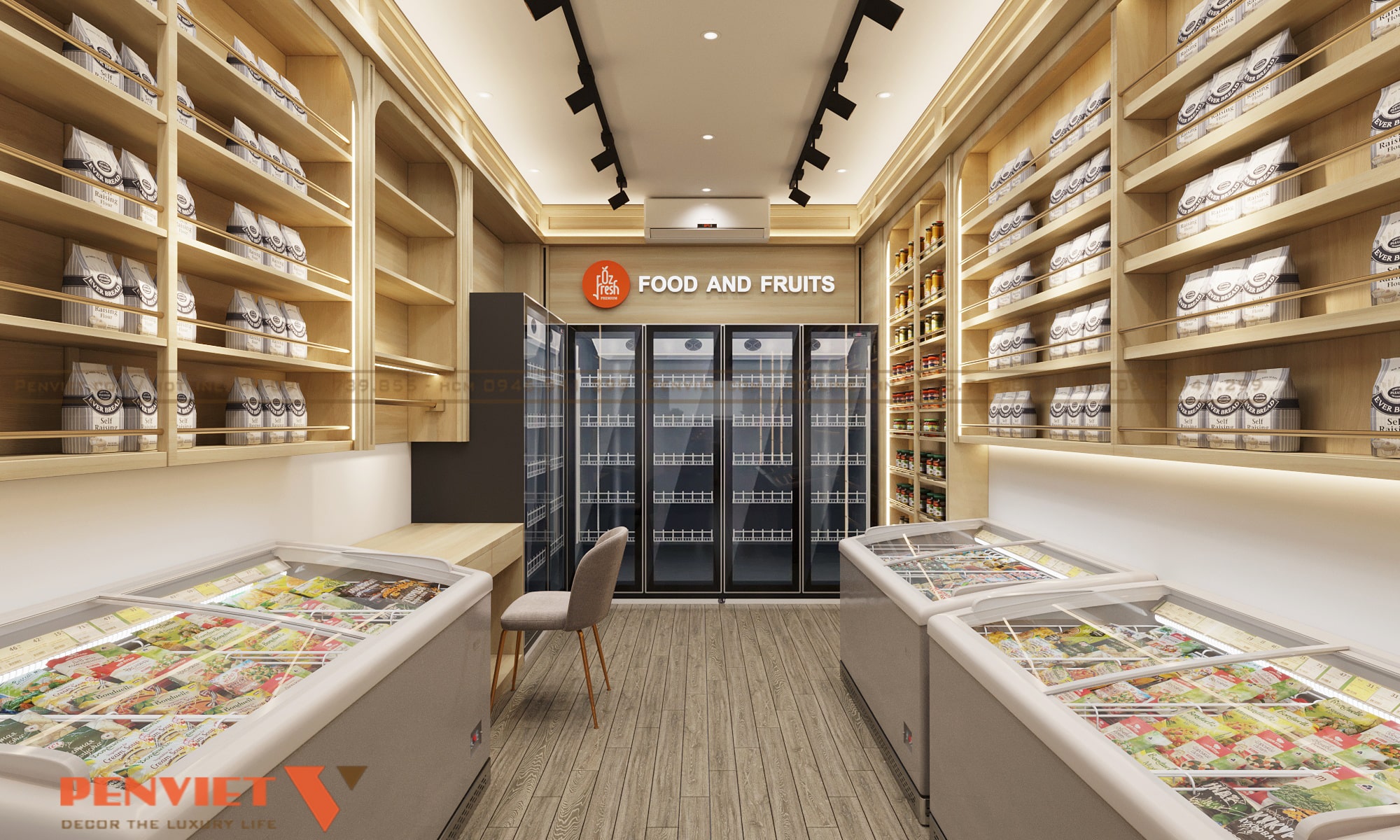 Điểm nhấn ở cuối không gian là bảng hiệu “Food and Fruits” kết hợp logo thương hiệu. Bên cạnh đó, bàn làm việc nhỏ được bố trí hợp lý giữa hai dãy tủ để nhân viên kiểm hàng, dán nhãn và hỗ trợ khách mua nhanh. Không gian này mang lại cảm giác hiện đại, sạch sẽ và chuyên nghiệp.