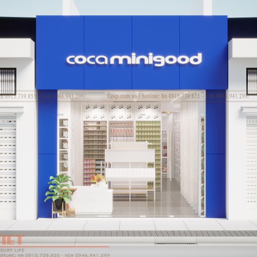 Mặt tiền thu hút người nhìn với dòng chữ màu trắng Cocaminigood, tên thương hiệu nổi bật trên nền xanh dương. Tưởng chừng như đơn giản nhưng lại là điểm thu hút khiến mọi người tập trung vào dòng chữ duy nhất, gia tăng khả năng ghi nhớ tên thương hiệu.