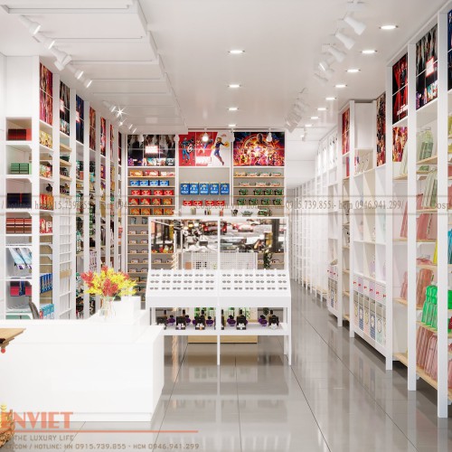 Những ngăn kệ có kích thước khác nhau đều được đội ngũ kiến trúc sư tính toán một cách cẩn thận và tỉ mỉ phù hợp tương thích với các kích thước khác nhau của hàng hóa. Phía trên cùng của tủ được trang trí bằng tranh backlist cho không gian đặc biệt và ấn tượng. Bố trí hệ thống đèn led đủ ánh sáng, không bị chói mắt và làm các sản phẩm trở nên bắt mắt, thu hút sự quan tâm của khách hàng.