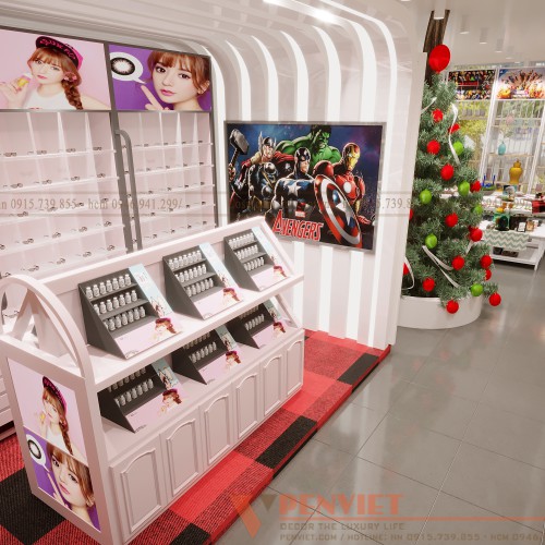 Điểm đặc biệt tiếp theo trong thiết kế siêu thị minigood là một gian hàng mỹ phẩm được thiết kế riêng biệt. Một Showroom mỹ phẩm nhỏ được thiết kế độc đáo và đẹp mắt, chắc chắn sẽ là điểm dừng chân của các chị em phụ nữ. Phân chia những ngăn nhỏ theo tầng để phân loại những danh mục sản phẩm. Tầng dưới cùng của những chiếc tủ là các năng tủ không chia ngăn, chứa được một lượng lớn các hàng hóa mỹ phẩm.