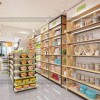 Không gian nội thất bên trong được bố trí theo thể liền mạch và thống nhất. Từng kệ giá trưng bày sản phẩm được lắp đặt nối tiếp nhau và sát tường nhằm tạo khoảng trống di chuyển ở giữa được thoải mái.