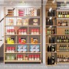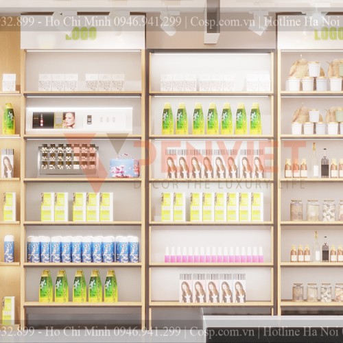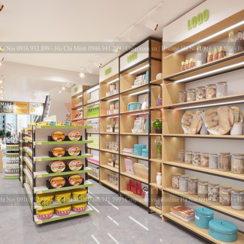 Do đặc thù kinh doanh là buôn bán tạp hóa, các sản phẩm thiết yếu mỗi ngày nên các kệ trưng bày trong thiết kế siêu thị mini này cũng đòi hỏi phải có nhiều ngăn tầng cũng như độ chắc chắn cao để đáp ứng được lượng mặt hàng lớn và đa dạng này. Mỗi chiếc kệ đều được làm bằng gỗ với phần khung kim loại chắc chắn.