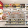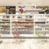 Đi vào phía bên trong chính là không gian bày bán các nhu yếu phẩm. Hệ thống tủ làm mát, giá kệ trưng bày được bố trí sát tất cả các bức tường nhằm tối ưu diện tích cho mẫu thiết kế cửa hàng tiện lợi này. Những mẫu tủ kệ này đều được sơn màu trắng để tạo cảm giác sạch sẽ, gợi lên một không gian thông thoáng và rộng rãi.