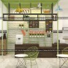 Một quầy bar nhỏ với máy pha chế và các dụng cụ thiết yếu khác để làm nên những ly nước giải khác được đặt giữa cửa hàng. Khu vực này được thiết kế với màu xanh lá nổi bật, cùng những chiếc kệ gỗ nâu giúp phân chia không gian rất tốt. Đối diện vẫn có một chiếc giá để đồ nhỏ để trưng bày một số sản phẩm mà cửa hàng đang bán.