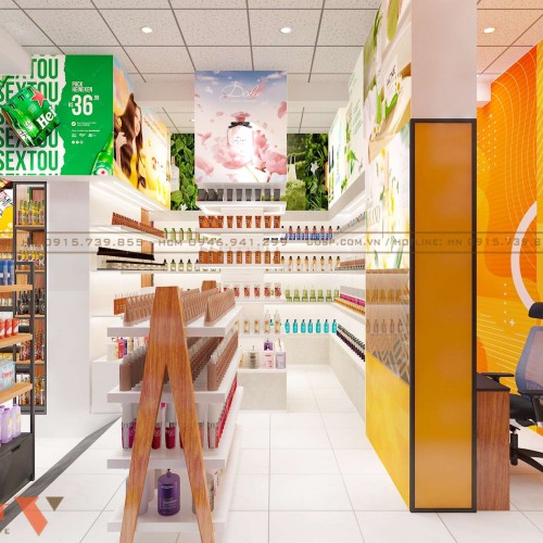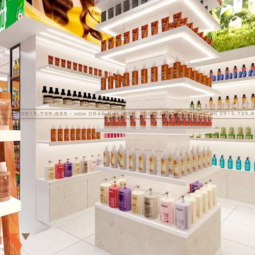Khu vực trưng bày mỹ phẩm, dầu gội có thiết kế với gam màu chủ đạo riêng, tạo dấu ấn rất đặc trưng. Đèn LED được setup bên trong các ngăn tủ để làm nổi bật cho sản phẩm khi trưng bày.
