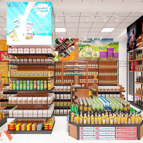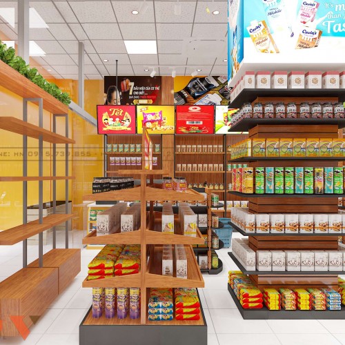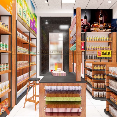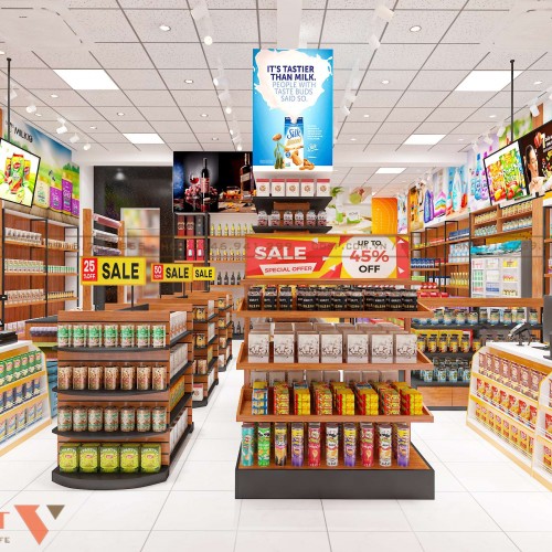 Quầy tầng thấp đặt ở trung tâm giúp không làm giới hạn tầm nhìn của khách hàng đến mua sắm. Các loại kệ ở khu vực chính giữa siêu thị hầu như có thể trưng bày được sản phẩm ở các mặt khác nhau tiết kiệm diện tích. Khách hàng đứng ở vị trí nào cũng có thể thoải mái ngắm nhìn hàng hóa để dễ dàng chọn mua sắm.