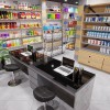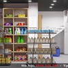 Hệ thống kệ tại cửa hàng này còn trở nên nổi bật hơn nhờ nền xám của tường phía sau tạo độ tương phản. Tiếp đến là các giá để đồ được làm bằng chất liệu gỗ công nghiệp có màu nâu nhạt rất ăn nhập với màu gỗ của mặt sàn, tạo nên sự đồng điệu trong cách phối hợp màu sắc trong mẫu thiết kế siêu thị mini này.