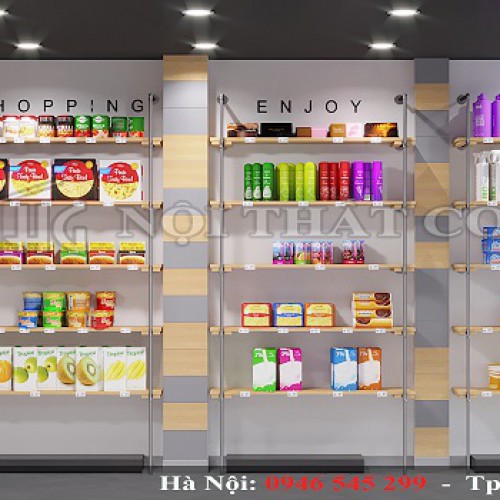 Tại đây, chúng tôi lắp đặt hệ thống kệ sát tường dùng để trưng bày sản phẩm với chất liệu gỗ thông khung sắt chắc chắn. Chúng đều có ưu điểm là giúp tiết kiệm diện tích, tối ưu hóa không gian trưng bày và mang lại vẻ đẹp thẩm mĩ cho nội thất siêu thị tạp hóa. Chúng tôi chọn gỗ thông vì vật liệu này giữ được đặc trưng của gỗ tự nhiên là chống nước, có họa tiết vân đa dạng, mang đến độ bền đẹp. Bên cạnh đó, gỗ thông có hương thơm tự nhiên dễ chịu rất thích hợp sử dụng trong các thiết kế cửa hàng. Gỗ thông được xử lý có đặc tính chống cong vênh, mối mọt giúp cho sản phẩm duy trì được sự bền đẹp mà giá thành cũng rất rẻ.
