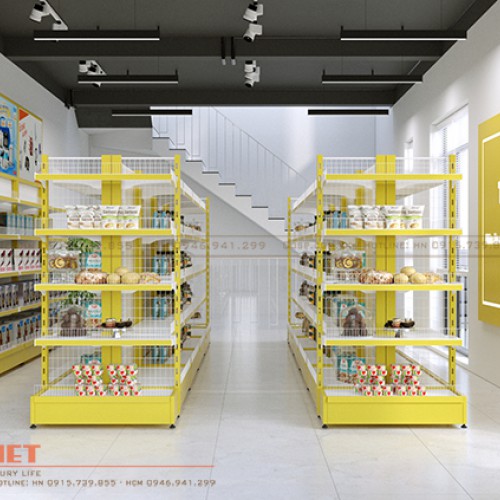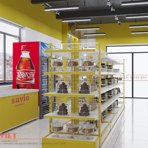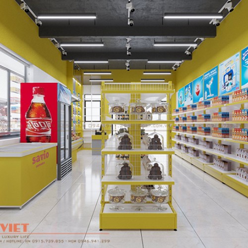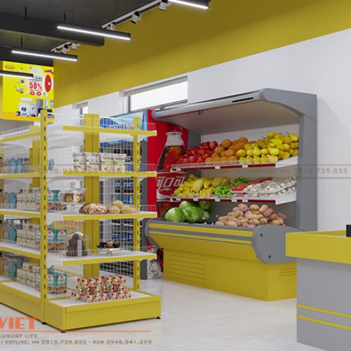 Màu vàng được chúng tôi lựa chọn làm gam màu chủ đạo tạo nên sự trẻ trung, năng động. Đồng thời, nó cũng khiến cho mẫu thiết kế siêu thị mini trở nên độc đáo và nổi bật hơn.