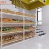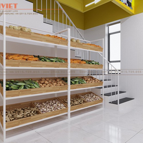 Với mẫu thiết kế siêu thị mini TG Mart, Penviet sử dụng gỗ cao su ghép thanh kết hợp với khung sắt sơn tĩnh điện và bánh xe cho kệ hoa quả, giúp việc di chuyển được dễ dàng. Với đặc tính chống thấm, chống ẩm, những loại vật liệu này vô cùng phù hợp để bày bán các loại rau quả tươi.