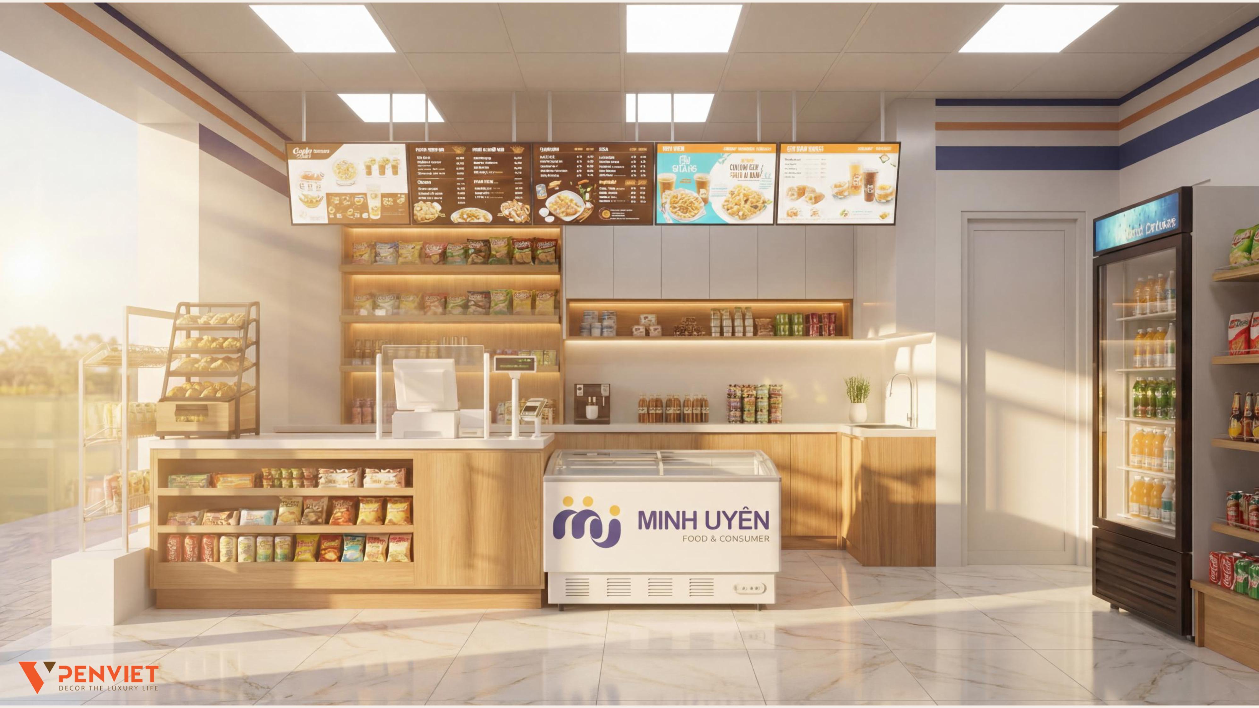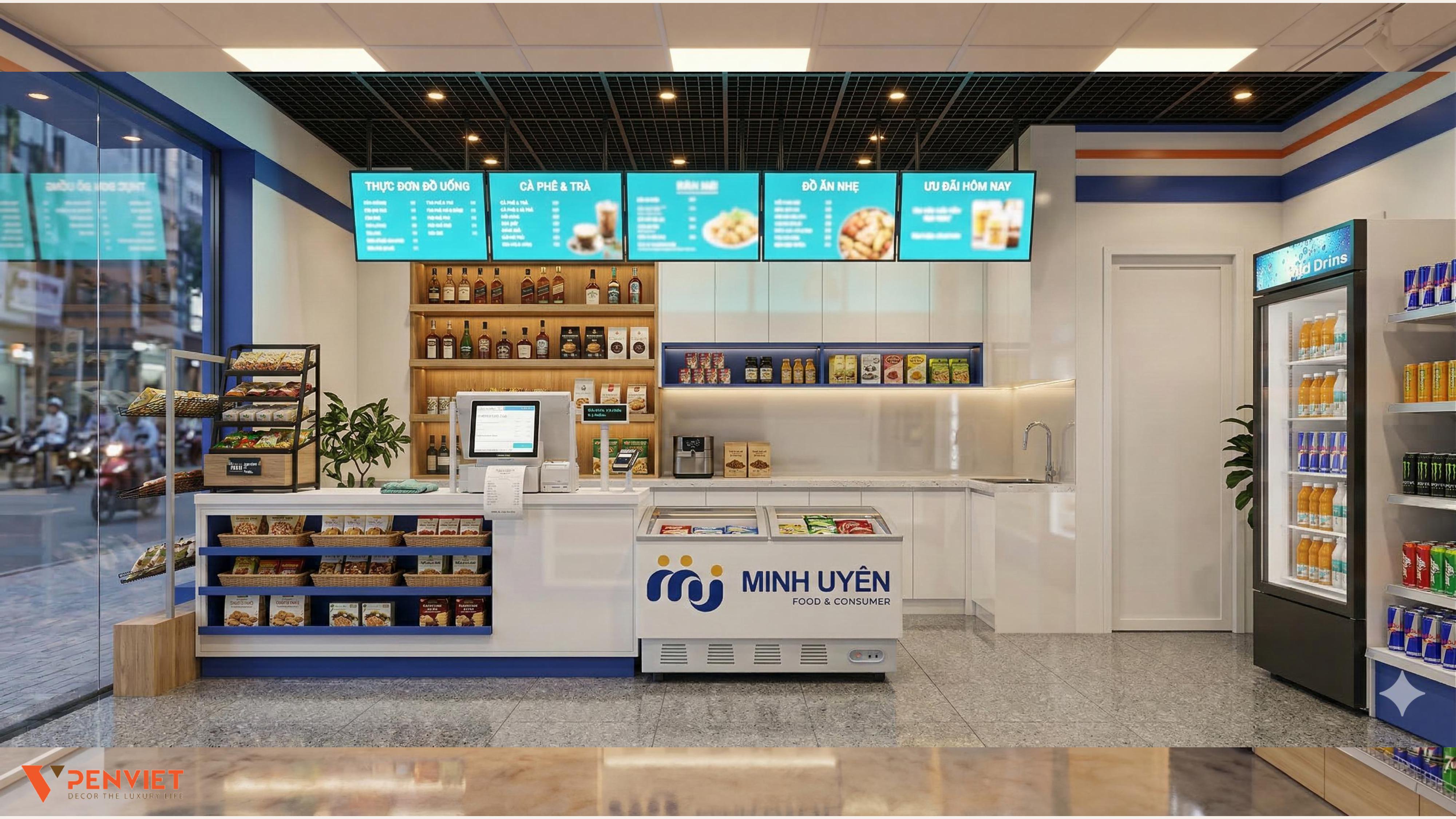 Không gian phía sau quầy được tận dụng làm kho mini. Nhân viên dễ thao tác và bổ sung hàng nhanh. Việc bố trí hợp lý giúp giảm thời gian phục vụ. Đây là yếu tố quan trọng trong mô hình tiện lợi.