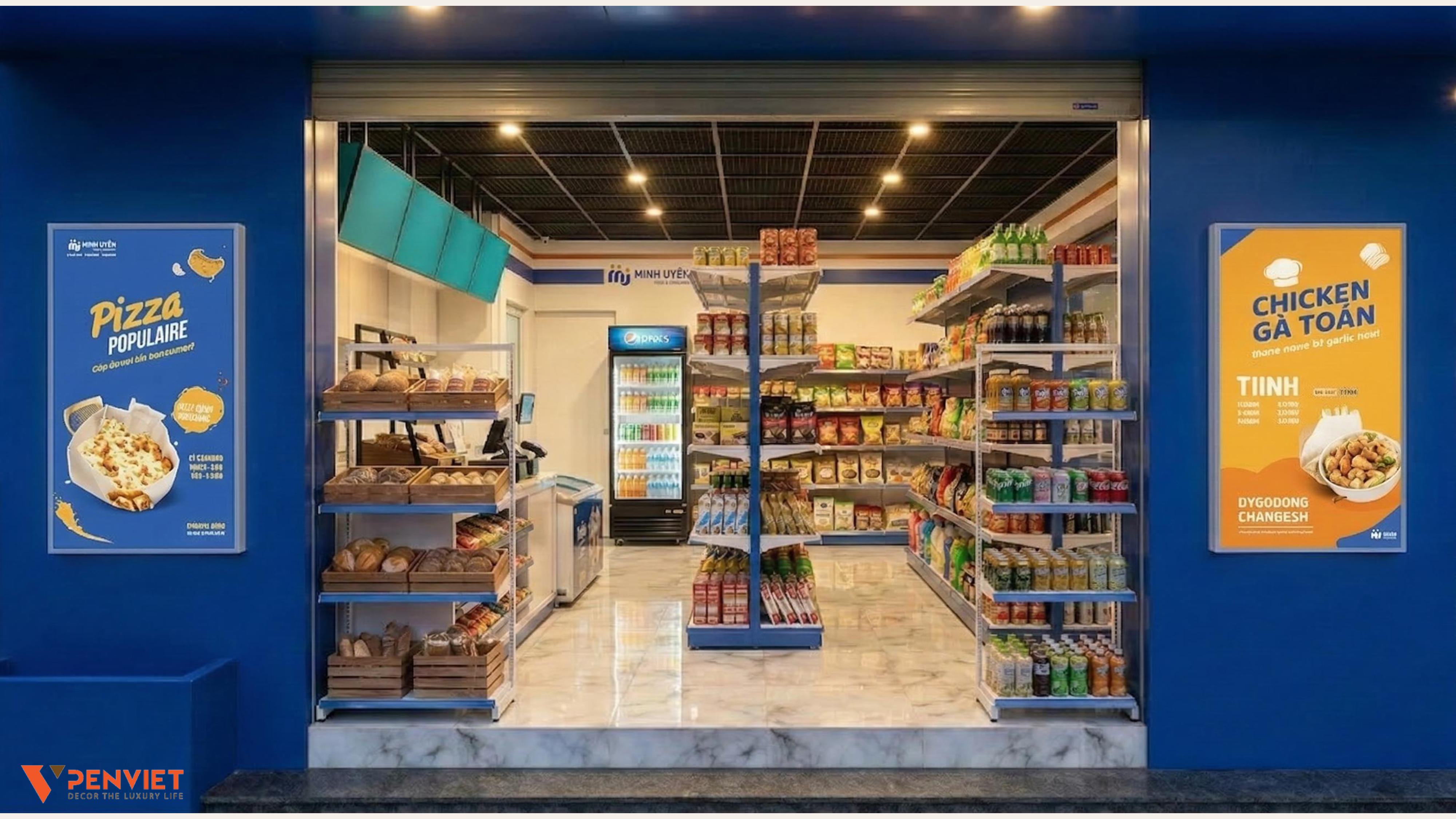 Thiết kế này phù hợp với khu phố đông người qua lại. Khách hàng dễ dàng quan sát sản phẩm bên trong. Điều này góp phần tăng tỷ lệ ghé thăm tự nhiên. Đây là điểm mạnh quan trọng trong mô hình siêu thị tiện lợi.
