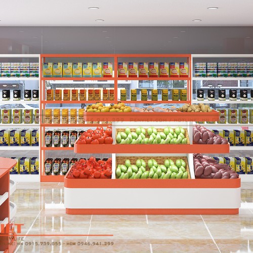 Sự tiện lợi cho khách hàng là một trong những tiêu chí đầu tiên được các kiến trúc sư Penviet quan tâm khi thiết kế siêu thị mini Bảo Nam Mart. Theo đó, tại vị trí trung tâm của cửa tiệm, chúng tôi setup kệ tháp hoa quả với độ cao tầm trung, giúp khách hàng không bị cản tầm nhìn. Vẫn là chất liệu gỗ MDF phủ Melamine chống xước được chia thành các ngăn ô vuông vắn, trưng bày hàng hóa theo hướng mở rộng từ đó kích thích nhu cầu mua sắm của người tiêu dùng, gia tăng doanh số bán hàng.