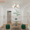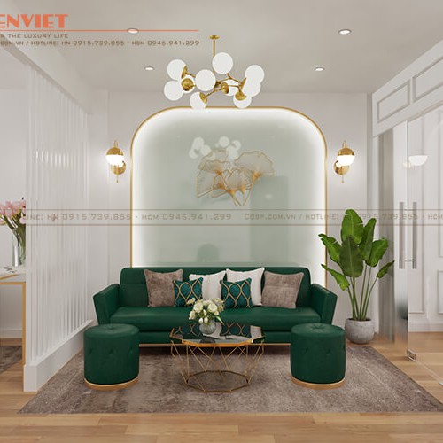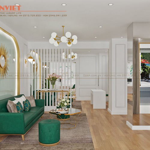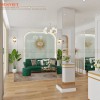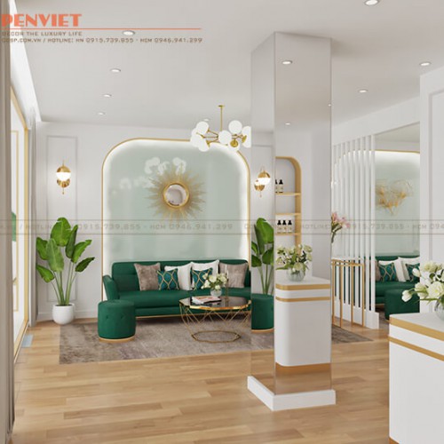 Những chi tiết nhấn nhá màu xanh lá cây - một trong những màu sắc đang dẫn đầu xu hướng thiết kế nội thất hiện nay và màu nhũ vàng đặc trưng của phong cách Cổ Điển và Tân Cổ điển được đan xen khéo léo khiến cho thiết kế spa trở nên cuốn hút. Một đặc trưng nữa của các phong cách này được Penviet sử dụng một cách linh hoạt và sáng tạo đó làm các đường phào chỉ trang trí tạo nên sự đối xứng cho không gian.