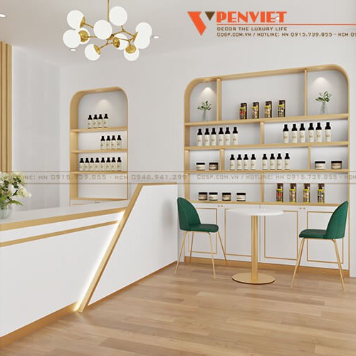 Phía ngoài spa, Penviet bố trí hệ thống tủ kệ âm đóng hộp thạch cao khung xương kết hợp với gỗ MDF chống ẩm phun sơn 2K để trưng bày sản phẩm. Chúng tôi cũng thiết kế thêm đèn Led dây hắt đợt, đèn downlight nhằm làm nổi bật các mặt hàng tại đây.