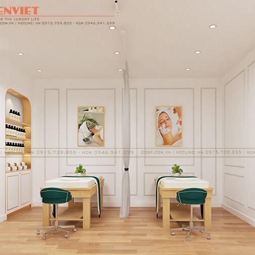 Thiết kế spa cũng đáp ứng được các tiêu chuẩn của Hiệp hội Spa quốc tế khi tạo nên sự riêng tư cho khách hàng thông qua việc sử dụng rèm che ngăn cách các giường chức năng khung gỗ, nệm bọc vải. Điều này góp phần nâng cao chất lượng phục vụ tại cơ sở làm đẹp này.