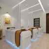 Màu sáng làm chủ đạo của căn phòng như khiến không gian rộng mở hơn. Đặc biệt chiếc đèn chùm cùng với quầy tiếp tân họa tiết và kiểu dáng độc đáo, bắt mắt tạo sự cuốn hút đến mê hoặc với bất cứ vị khách nào. Một vài chậu cây xanh được đặt trong phòng, cạnh bàn tiếp khách tạo sự trong lành mà sảng khoái cho khách hàng.