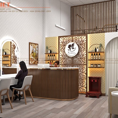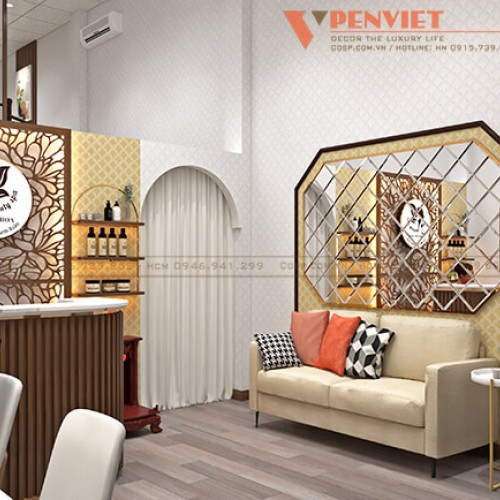 Lắng nghe nguyện vọng của chủ đầu tư kết hợp với khảo sát hiện trạng, Penviet tư vấn cho khách hàng mẫu thiết kế spa mang phong cách hiện đại, sử dụng màu vàng, nâu làm điểm nhấn giúp mang đến sự thân thuộc, gần gũi nhưng cũng không kém phần sang trọng cho cửa tiệm.