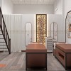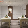 Việc bố trí các giường trị liệu khung gỗ và cách setup, décor tại phòng chức năng cho thấy sự liên kết giữa các không gian.
