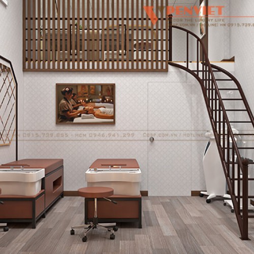 Khi thiết kế spa Thanh Hoa, các kiến trúc sư Penviet luôn quan tâm đến trải nghiệm của người dùng. Điều này thể hiện ở việc lựa chọn ghế ngồi chân gỗ, tựa nhựa tạo sự thuận tiện cho khách hàng.
