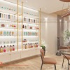 Bên cạnh đó, các kiến trúc sư cũng đã tận dụng bức tường để thiết kế hệ tủ trưng bày. Sử dụng những đợt kệ bắt tường bằng gỗ MDF phun sơn 2k đây quả là một giải pháp hoàn hảo với những cửa tiệm có diện tích hạn chế.