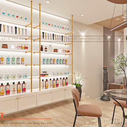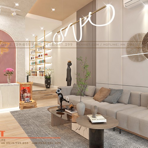 Qua quá trình làm việc, trao đổi và biết được mong muốn của chủ đầu tư kiến trúc sư đã lựa chọn phong cách thiết kế hiện đại sử dụng những hình khối kết hợp với sự mềm mại của đường cong để thiết kế cho cửa tiệm. Ở đây chúng tôi sử dụng màu trắng làm màu chủ đạo kết hợp tông màu hồng, nhấn nhá của vật liệu vàng gold và giấy dán tường màu bê tông tạo nên một tổng thể không gian trở nên vô cùng sang trọng và ấn tượng khi khách hàng đến trải nghiệm dịch vụ.